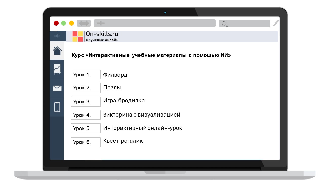 - Курс «Интерактивные учебные материалы с помощью ИИ»: 6 уроков+ бонусный, видеоинструкции, примеры и текстовые материалы, сертификат (36 часов)